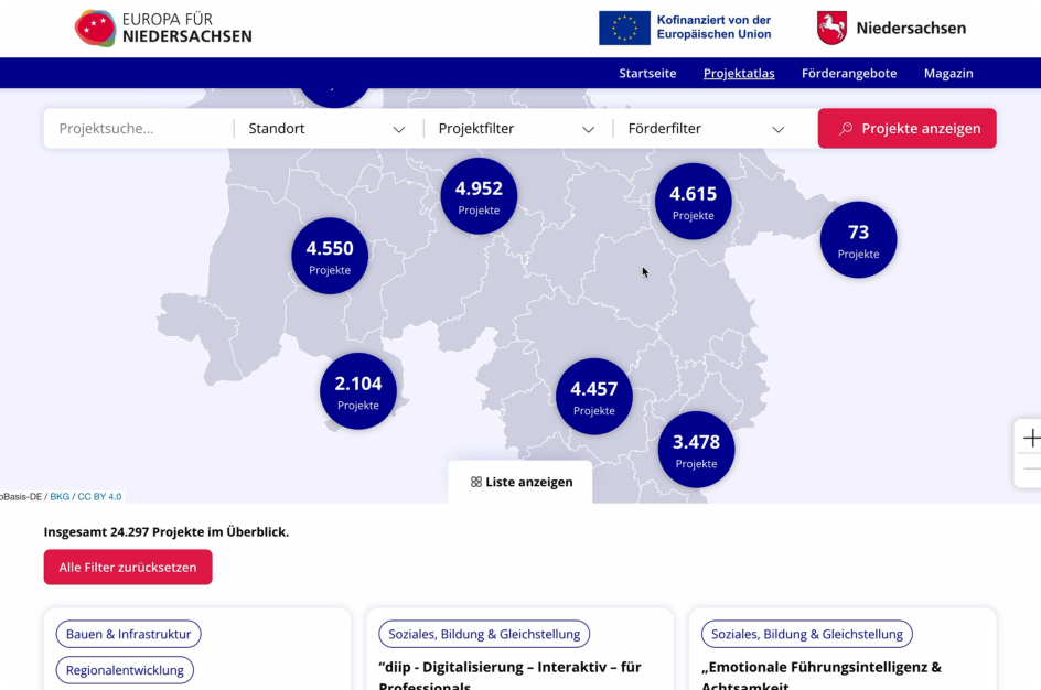 Mit einem digitalen Projektatlas zeigt das Land Niedersachsen, welche EU-geförderten Projekte es dort gibt, wer gefördert wurde und wie man das passende Angebot für eigene Vorhaben findet. Nach einem umfassenden Relaunch der Website gestaltet sich die Suche jetzt so nutzungsfreundlich wie nie zuvor.