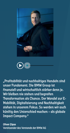 Seit 2020 integriert die BMW Group Geschäfts- und Nachhaltigkeitsbericht in einen Online-Report. Gemeinsam mit 3st haben die Münchner das Konzept im Berichtsjahr 2021 weiter ausgebaut. Basierend auf dem neuen Corporate Design entstand so ein Report mit Farbverläufen in satten Tönen, emotionaler Bildsprache und spannenden Storys. Inhaltlich dreht sich alles um die Schlagworte elektrisch, digital und zirkulär.