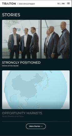 Der Wandel des Transportsektors ist nur zu bewältigen, wenn alle an einem Strang ziehen. Unter dem Titel TOGETHER belegen wir mit authentischen Storys, eindrucksvollen Bildern, interaktiven Grafiken und spannenden Videos, wie die Mitarbeiter und Partner der TRATON GROUP ihre Zusammenarbeit weiter intensivieren, um die nachhaltige Transformation der Transportbranche gemeinsam voranzutreiben.
