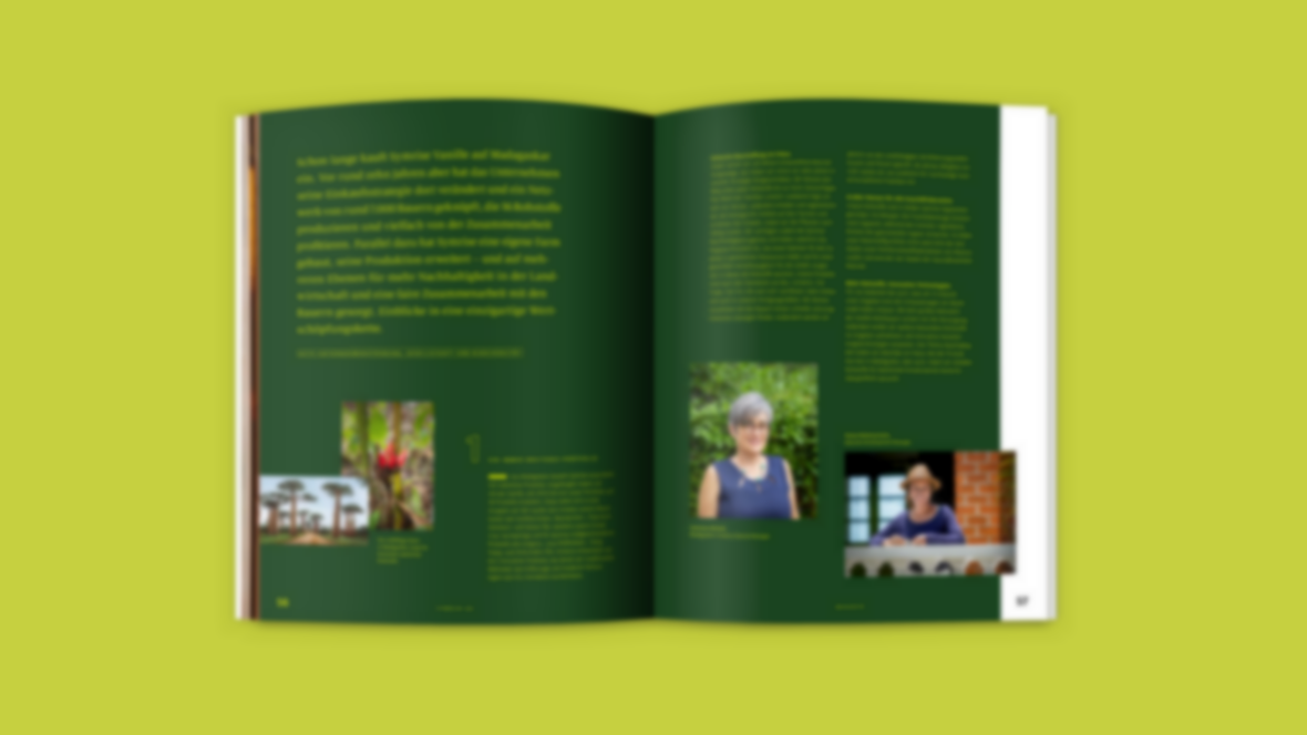 Eighteen exciting stories show how Symrise lives sustainability. We are present at vanilla cultivation in Madagascar and at the chemical synthesis of musk fragrances in the USA. The photos are taken from real life, strong colors and bold typography make you want to read more.