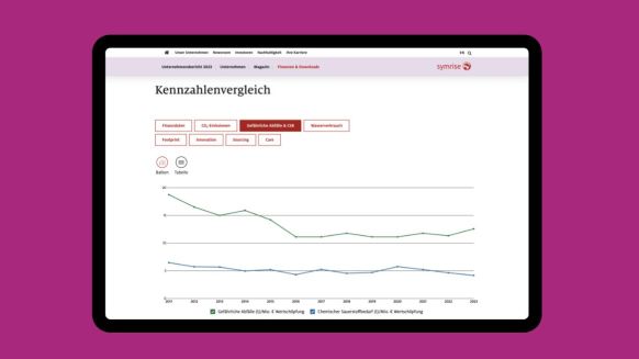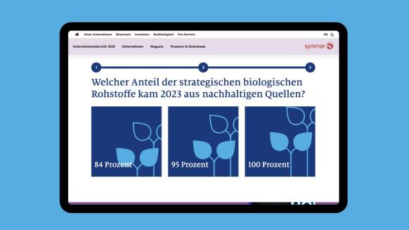 Do-it-yourself report: Those who want to delve deeper download the entire report, quick readers choose a summary of the topic that interests them most. The interactive value creation chart compares resources with the results achieved. Quiz questions invite you to puzzle over Symrise facts.
